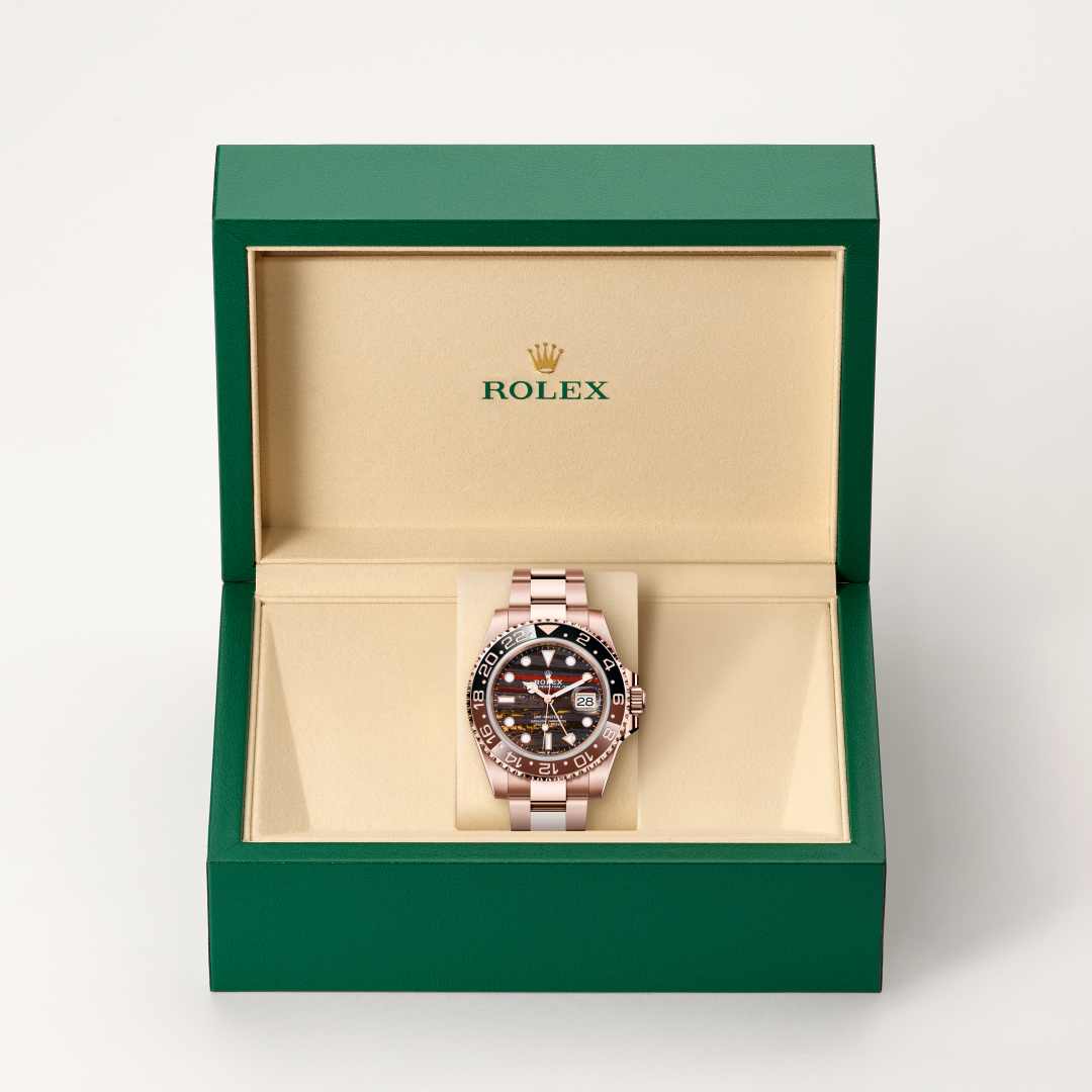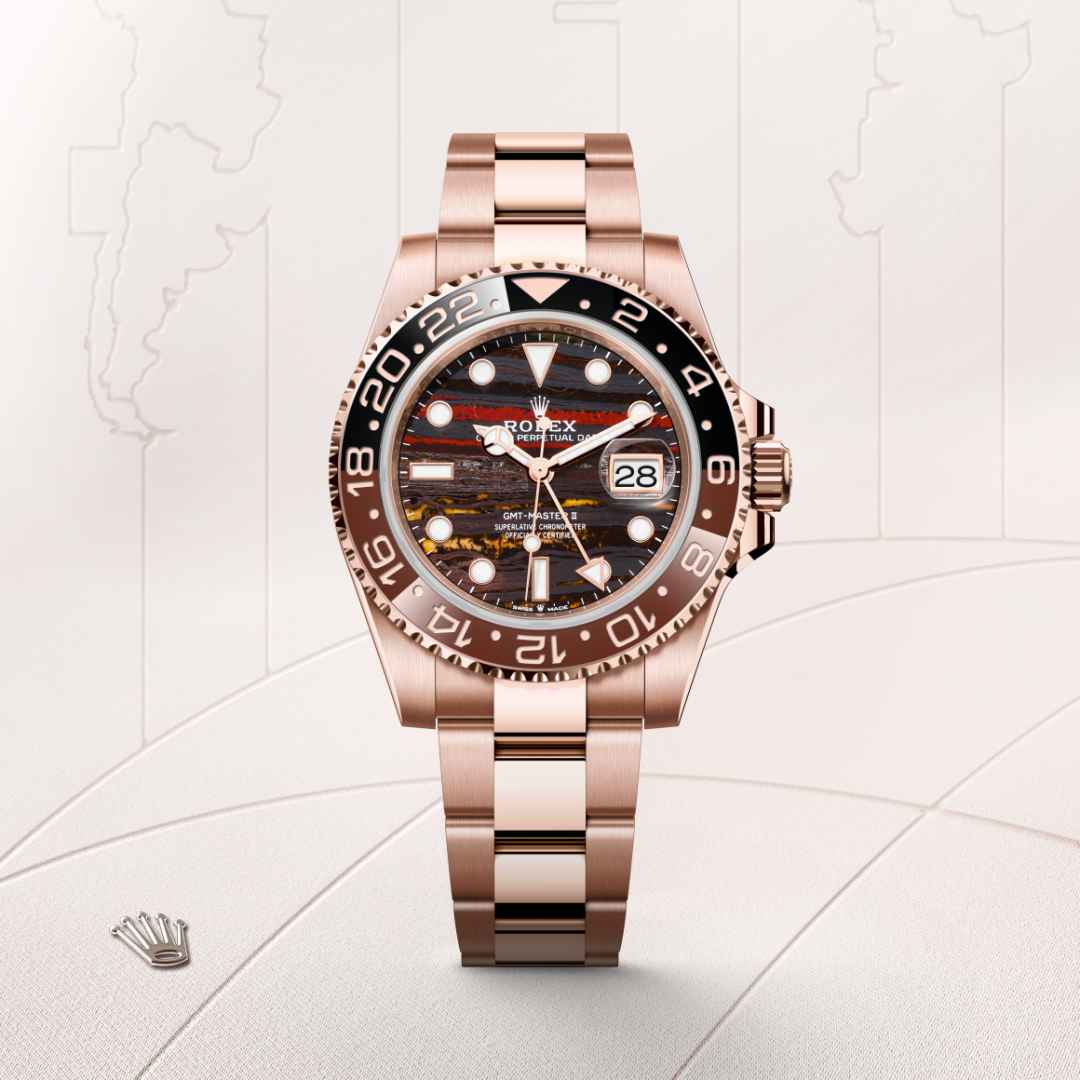 Este modelo apresenta um mostrador em olho de ferro e um Disco de luneta Cerachrom em cerâmica castanha e preta bicolor. Além dos convencionais ponteiros de horas, minutos e segundos, o GMT-Master II apresenta um ponteiro em forma de seta que dá a volta ao mostrador uma vez a cada 24 horas, além de uma luneta giratória bidirecional graduada de 24 horas. O inconfundível ponteiro colorido das 24 horas exibe a hora de referência de “casa” num primeiro fuso horário que pode ser lido nas graduações da luneta. A hora local do viajante é facilmente acertada, “saltando” de hora em hora, graças a um engenhoso mecanismo operado através da coroa: o ponteiro das horas pode ser ajustado no sentido horário e anti-horário de forma independente dos ponteiros dos minutos e segundos. Tal permite que os viajantes se adaptem ao novo fuso horário sem afetar a precisão da medição do tempo.